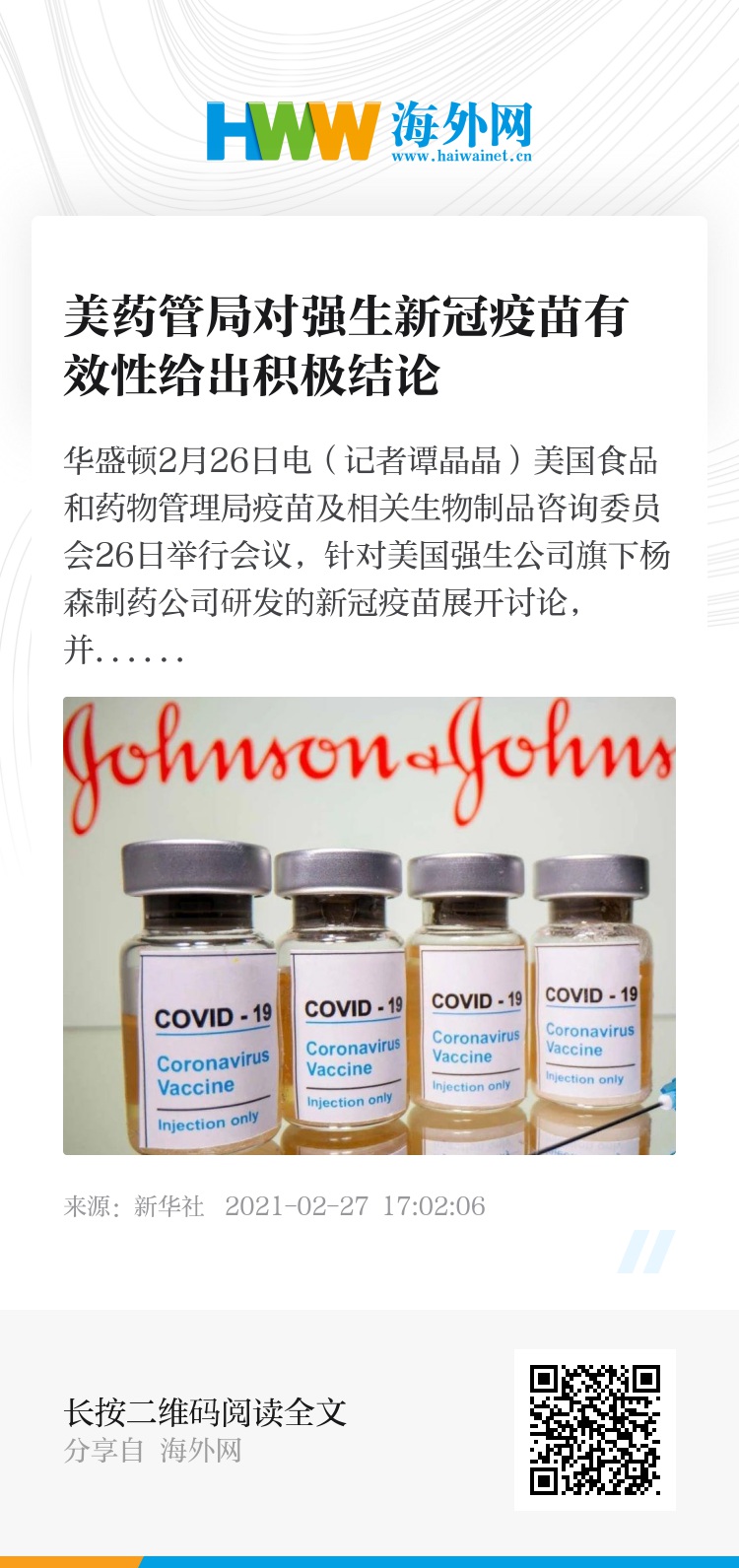 新华社华盛顿2月26日电(记者谭晶晶)美国食品和药物管理局疫苗及相关生物制品咨询委员会26日举行会议,针对美国强生公司旗下杨森制药公司研发的新冠疫苗展开讨论,并得出积极结论。美药管局当天发表声明说,将尽快批准这一疫苗的紧急使用授权申请。