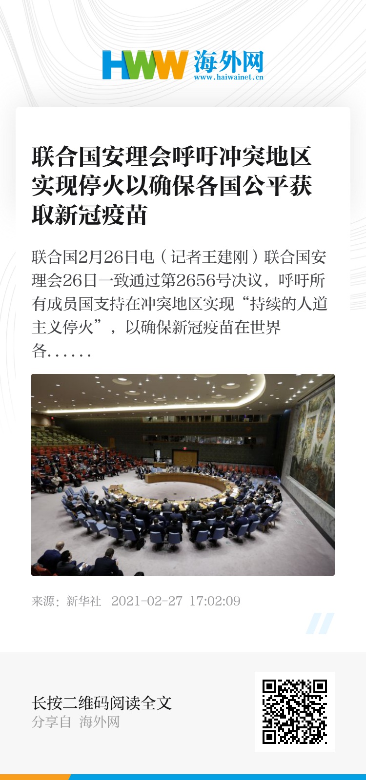 新华社联合国2月26日电(记者王建刚)联合国安理会26日一致通过第2656号决议,呼吁所有成员国支持在冲突地区实现“持续的人道主义停火”,以确保新冠疫苗在世界各地,包括在冲突地区都能实现公平获取。