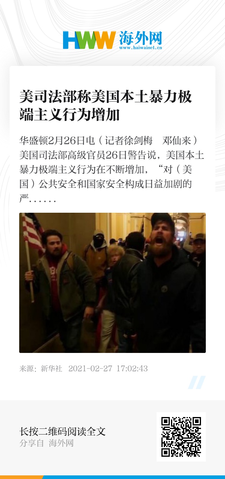 新华社华盛顿2月26日电(记者徐剑梅 邓仙来)美国司法部高级官员26日警告说,美国本土暴力极端主义行为在不断增加,“对(美国)公共安全和国家安全构成日益加剧的严重威胁”。