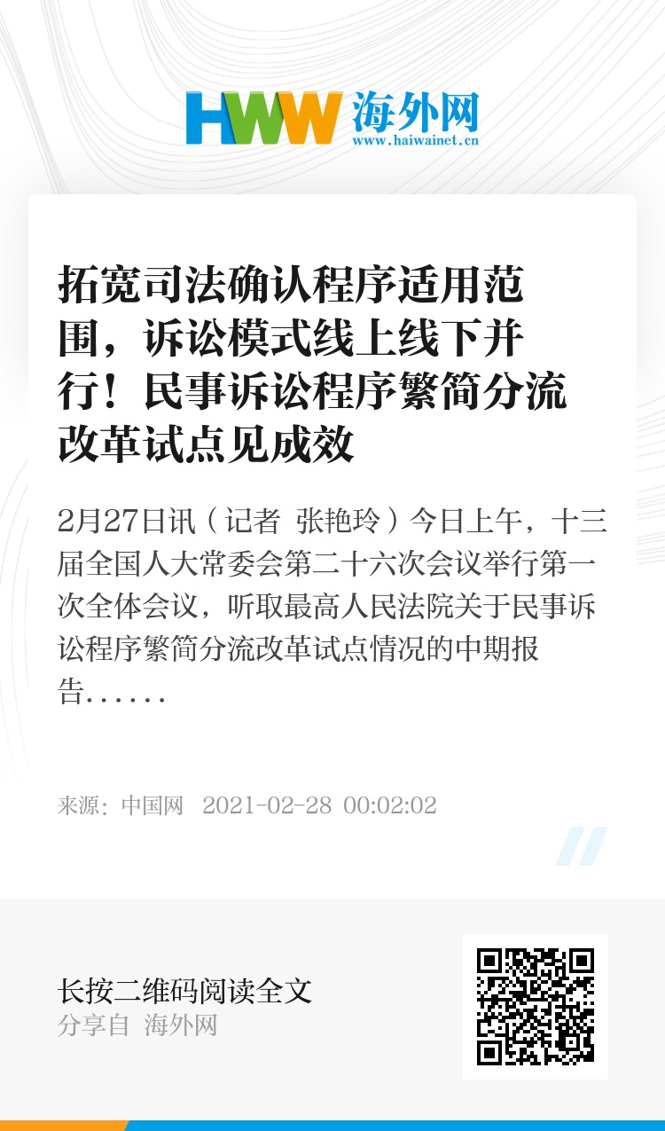 中国网2月27日讯(记者 张艳玲)今日上午,十三届全国人大常委会第二十六次会议举行第一次全体会议,听取最高人民法院关于民事诉讼程序繁简分流改革试点情况的中期报告。最高人民法院院长周强作报告。