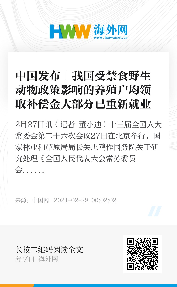 中国网2月27日讯(记者 董小迪)十三届全国人大常委会第二十六次会议27日在北京举行,国家林业和草原局局长关志鸥作国务院关于研究处理《全国人民代表大会常务委员会关于全面禁止非法野生动物交易、革除滥食野生动物陋习、切实保障人民群众生命健康安全的决定》和《中华人民共和国野生动物保护法》(以下简称“一决定一法”)执法检查报告及审议意见情况的报告。