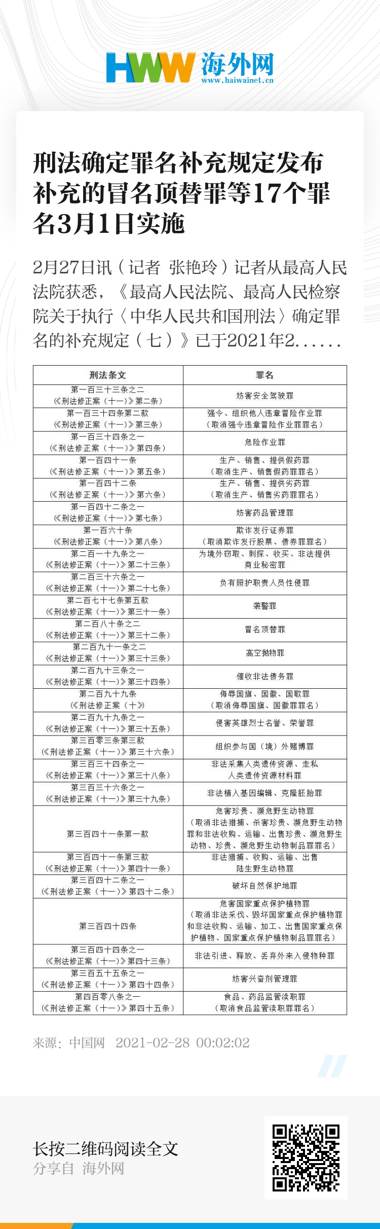 中国网2月27日讯(记者 张艳玲)记者从最高人民法院获悉,《最高人民法院、最高人民检察院关于执行〈中华人民共和国刑法〉确定罪名的补充规定(七)》已于2021年2月22日由最高人民法院审判委员会第1832次会议、2021年2月26日由最高人民检察院第十三届检察委员会第六十三次会议通过,于今天正式公布。该补充规定自2021年3月1日起施行。