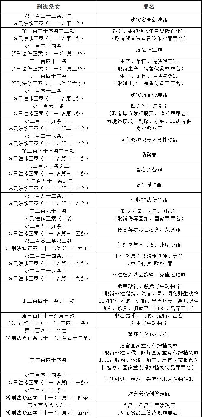 同时,对原10个罪名作了调整或者取消,形成强令、组织他人违章冒险作业罪,生产、销售、提供假药罪,生产、销售、提供劣药罪,欺诈发行证券罪,侮辱国旗、国徽、国歌罪,危害珍贵、濒危野生动物罪,危害国家重点保护植物罪,食品、药品监管渎职罪等罪名。