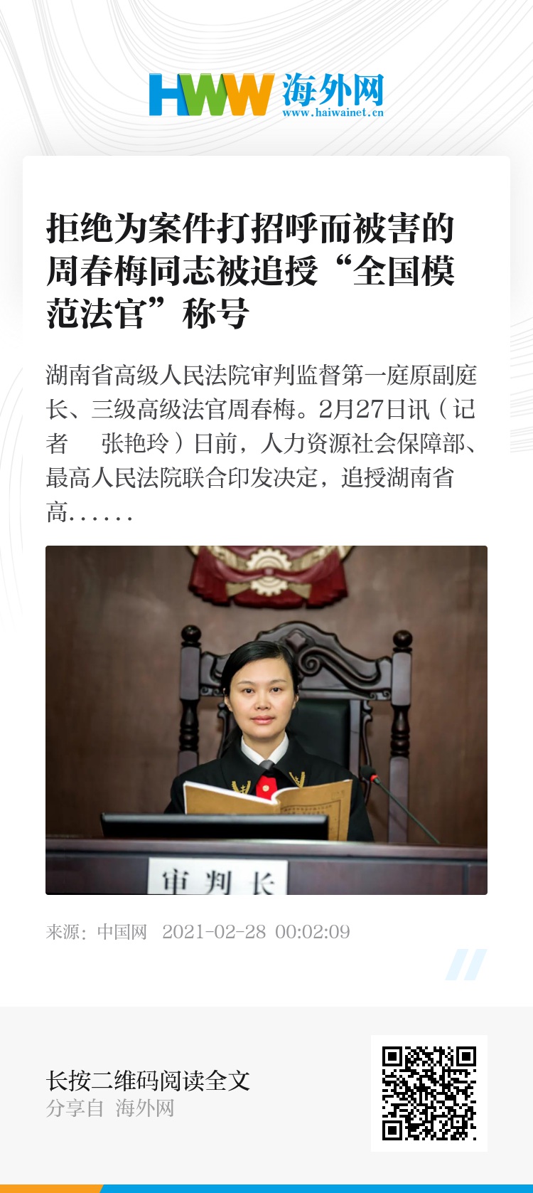 中国网2月27日讯(记者 张艳玲)日前,人力资源社会保障部、最高人民法院联合印发决定,追授湖南省高级人民法院审判监督第一庭原副庭长、三级高级法官周春梅同志“全国模范法官”称号。