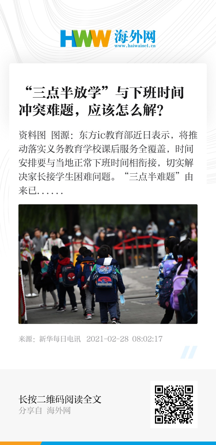 教育部近日表示,将推动落实义务教育学校课后服务全覆盖,时间安排要与当地正常下班时间相衔接,切实解决家长接学生困难问题。