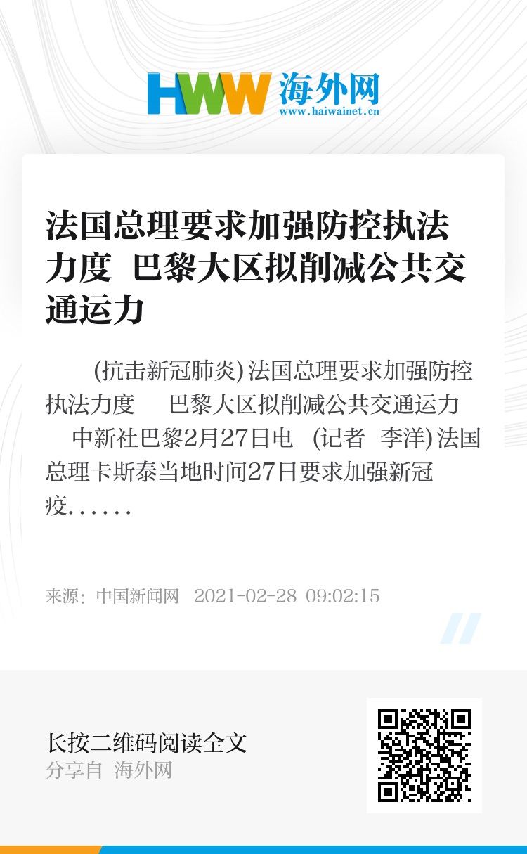 中新社巴黎2月27日电 (记者 李洋)法国总理卡斯泰当地时间27日要求加强新冠疫情防控执法力度,以遏制疫情恶化。巴黎大区公共交通管理部门表示,计划从下周起削减公共交通运力。