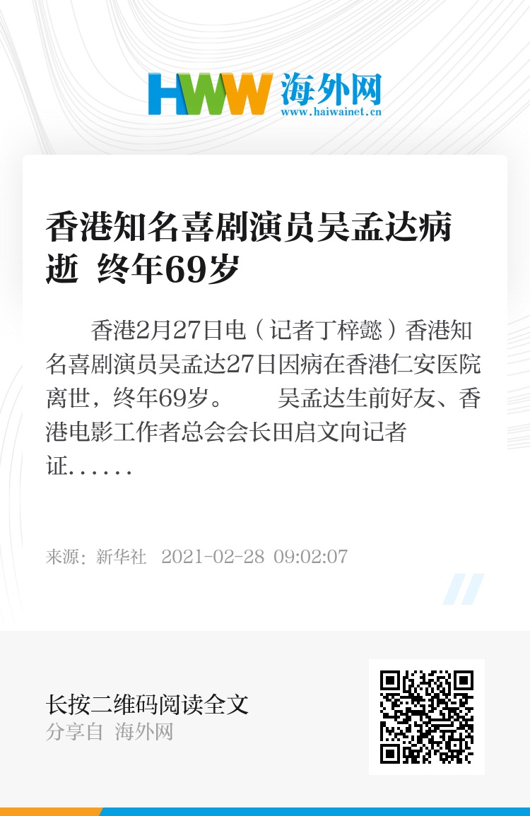 新华社香港2月27日电(记者丁梓懿)香港知名喜剧演员吴孟达27日因病在香港仁安医院离世,终年69岁。