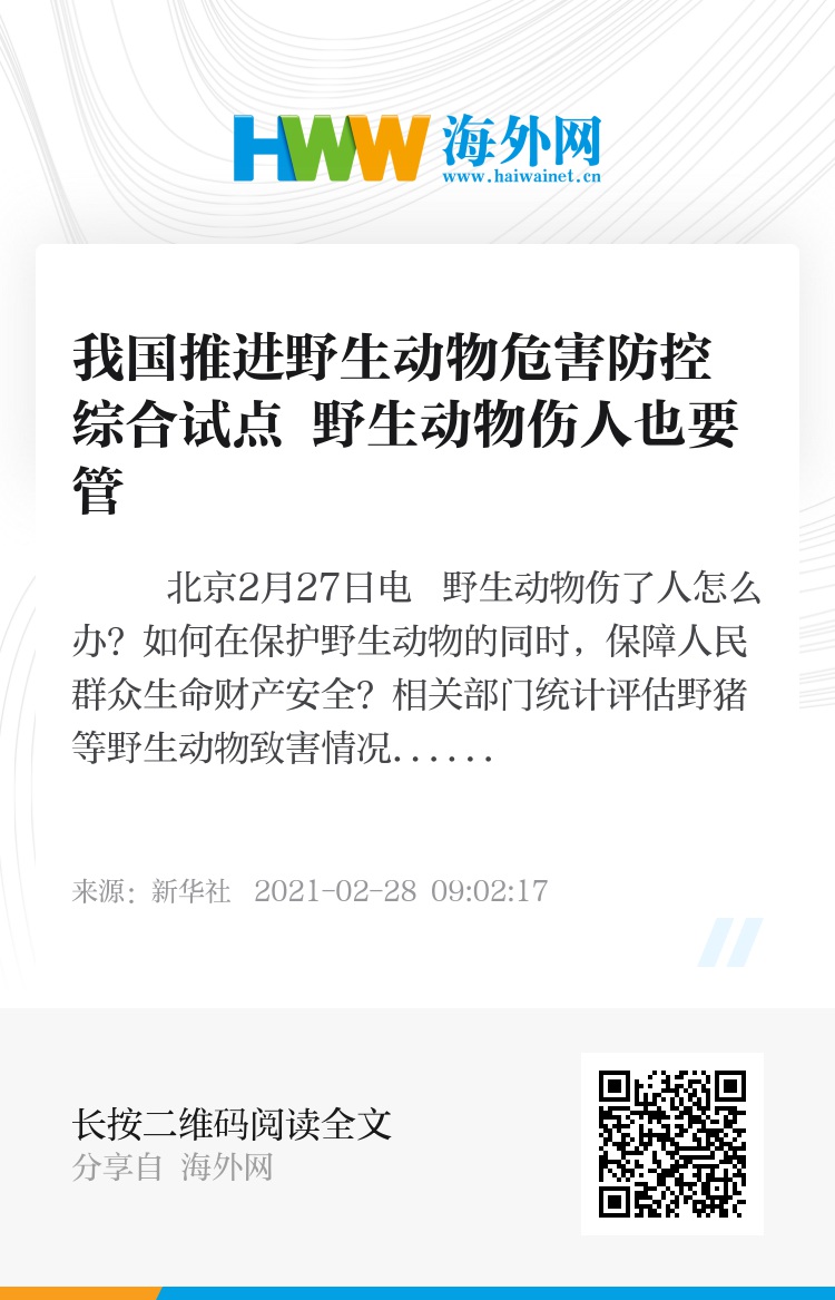 新华社北京2月27日电 野生动物伤了人怎么办?如何在保护野生动物的同时,保障人民群众生命财产安全?相关部门统计评估野猪等野生动物致害情况,研究部署防控综合试点。