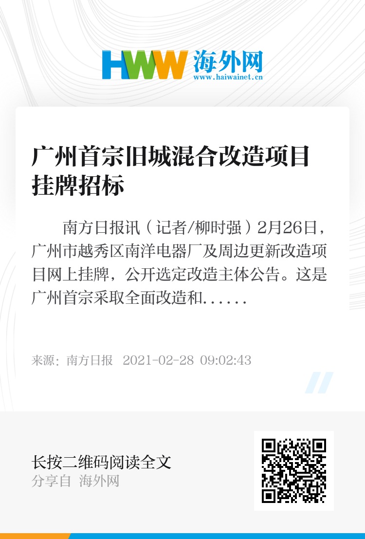 南方日报讯(记者/柳时强)2月26日,广州市越秀区南洋电器厂及周边更新改造项目网上挂牌,公开选定改造主体公告。这是广州首宗采取全面改造和微改造相结合的旧城混合改造项目。