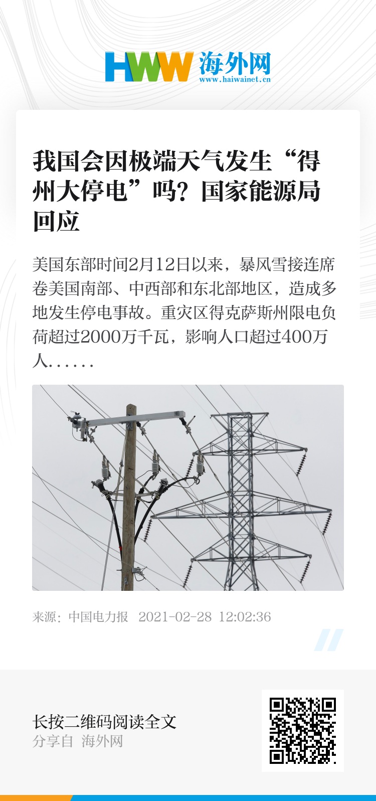 美国东部时间2月12日以来,暴风雪接连席卷美国南部、中西部和东北部地区,造成多地发生停电事故。重灾区得克萨斯州限电负荷超过2000万千瓦,影响人口超过400万人,对生产生活造成严重影响。