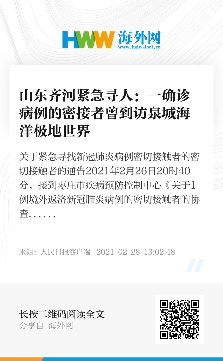 2021年2月26日20时40分,接到枣庄市疾病预防控制中心《关于1例境外返济新冠肺炎病例的密切接触者的协查管理函》,涉及一例新冠肺炎确诊病例的密切接触者王某某曾到过我县,王某某已于2月24日在当地集中隔离,目前王某某身体状况正常,无发热或呼吸道症状,核酸检测结果均为阴性。