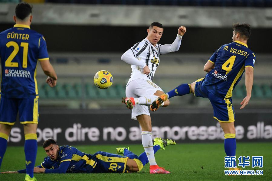 2月27日,尤文图斯队球员克·罗纳尔多(右二)和维罗纳队球员维洛索(右一)拼抢。当日,在2020-2021赛季意大利足球甲级联赛第24轮比赛中,尤文图斯队客场以1比1战平维罗纳队。新华社/法新