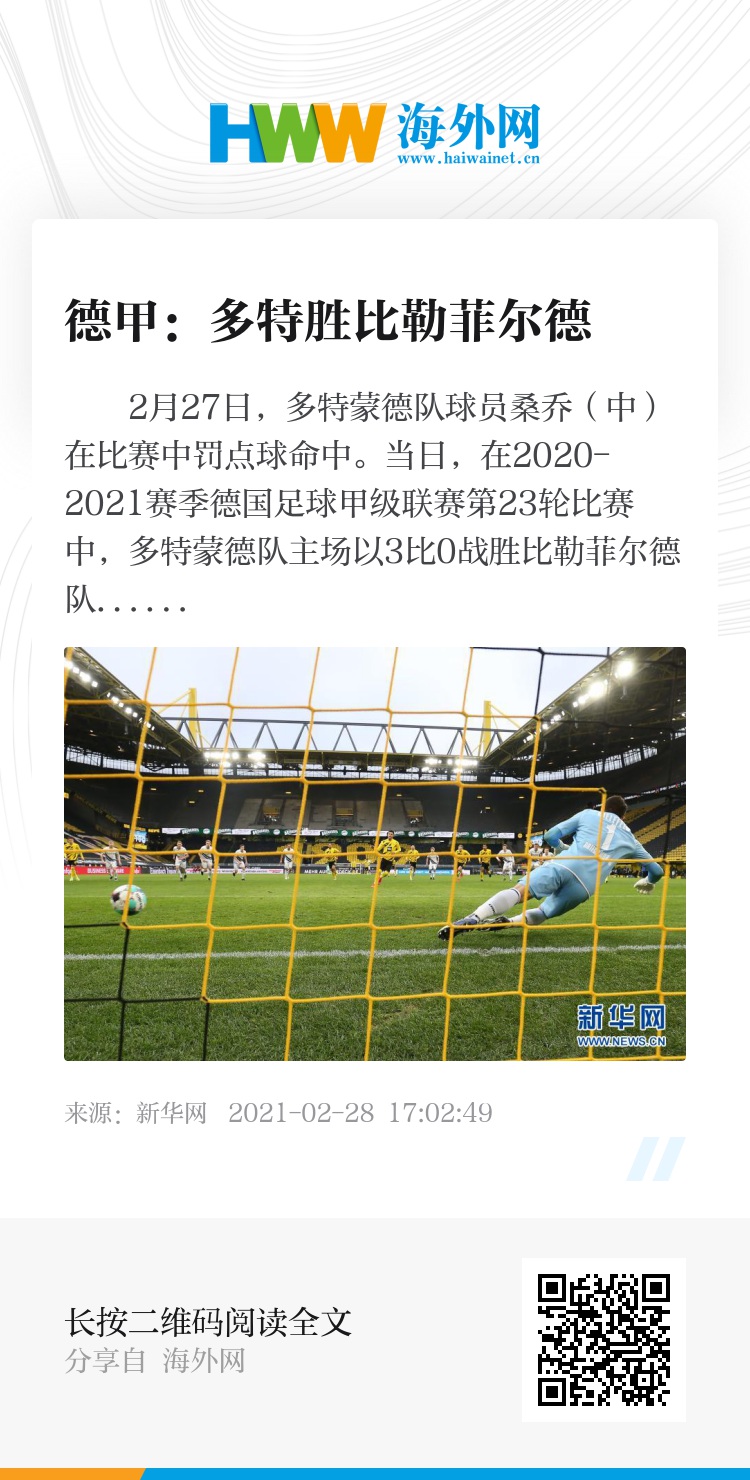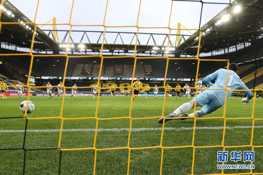 2月27日,多特蒙德队球员桑乔(中)在比赛中罚点球命中。当日,在2020-2021赛季德国足球甲级联赛第23轮比赛中,多特蒙德队主场以3比0战胜比勒菲尔德队。新华社发(约阿希姆·毕瓦勒兹 摄)