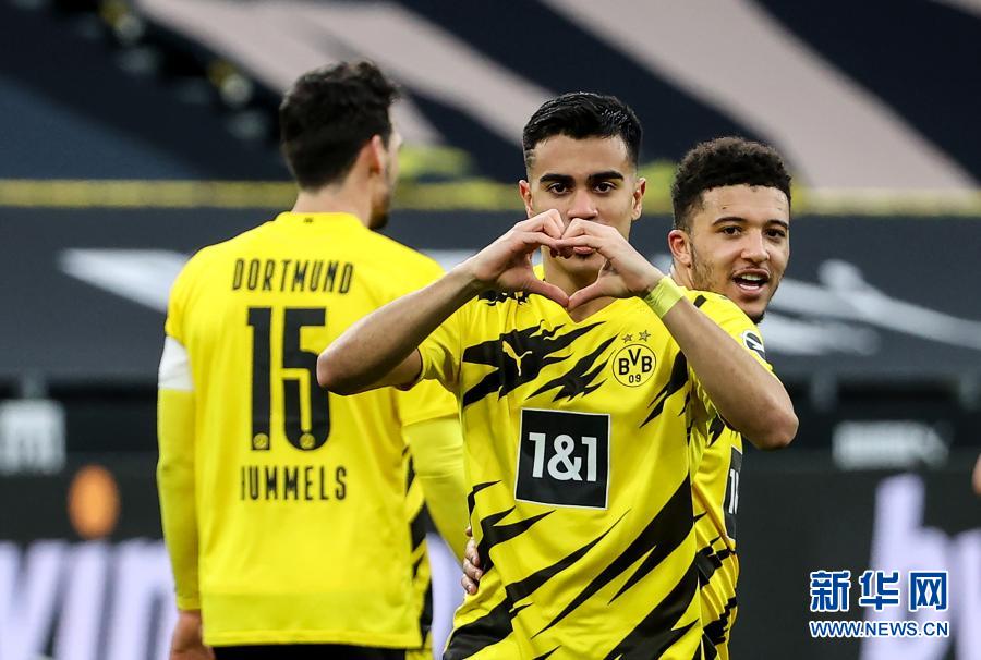 2月27日,多特蒙德队球员雷涅尔·热苏斯·卡瓦略(前)庆祝进球。当日,在2020-2021赛季德国足球甲级联赛第23轮比赛中,多特蒙德队主场以3比0战胜比勒菲尔德队。新华社发(约阿希姆·毕瓦勒兹 摄)