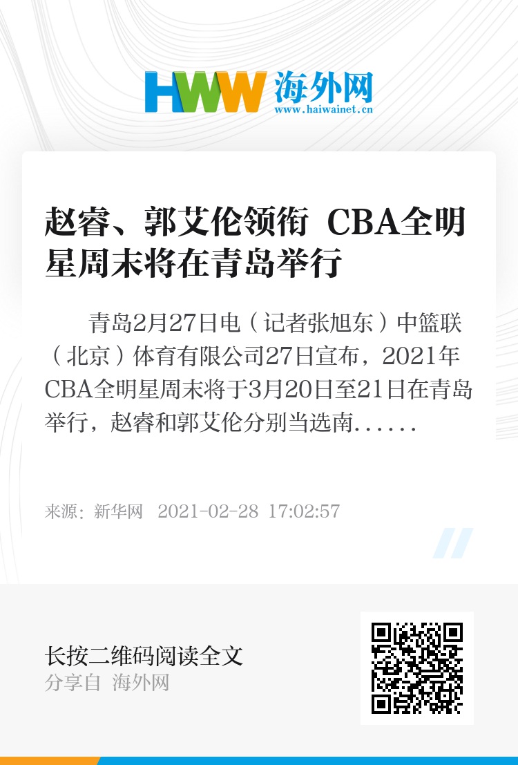 新华社青岛2月27日电(记者张旭东)中篮联(北京)体育有限公司27日宣布,2021年CBA全明星周末将于3月20日至21日在青岛举行,赵睿和郭艾伦分别当选南、北区票王,领衔两支全明星参赛队。