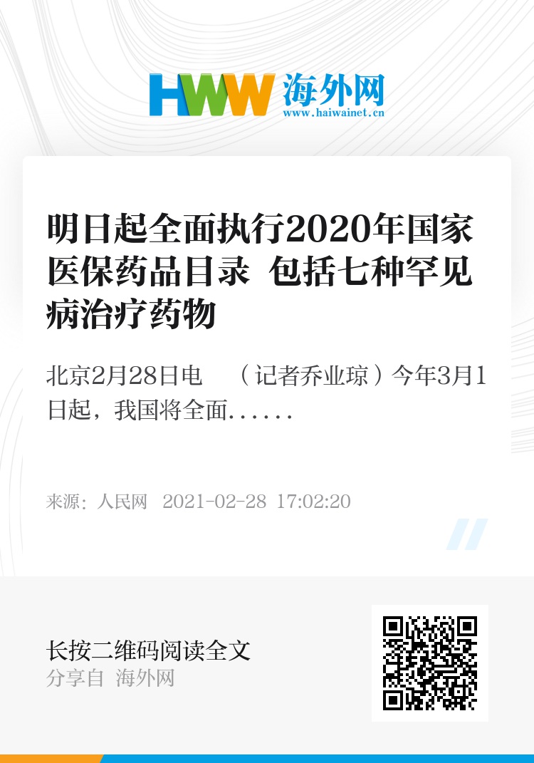 人民网北京2月28日电 (记者乔业琼)今年3月1日起,我国将全面执行2020年国家医保药品目录,其中,七种罕见病治疗药物纳入了国家医保目录。“这对罕见病患者和他们的家庭来说,是莫大的福音。”首都医科大学附属北京天坛医院副院长贾旺说。