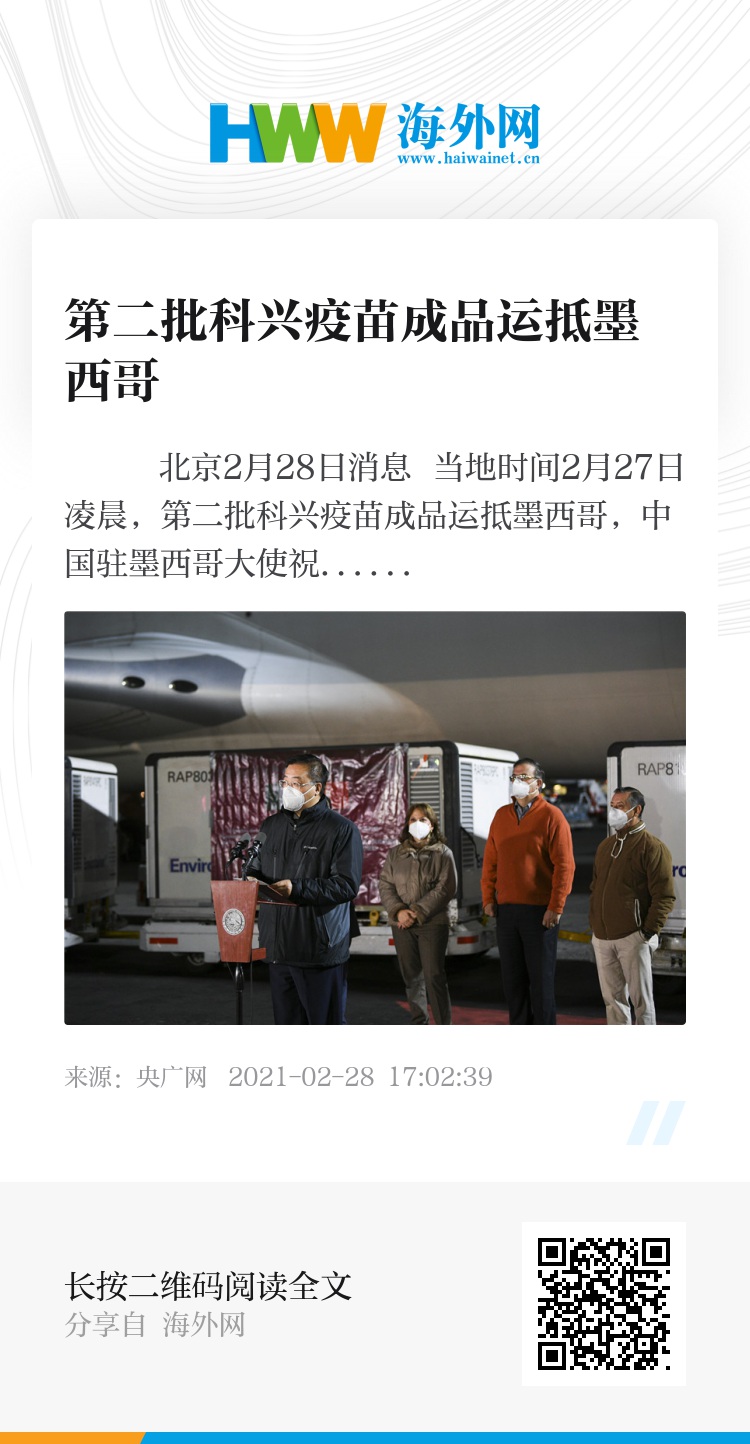 央广网北京2月28日消息 当地时间2月27日凌晨,第二批科兴疫苗成品运抵墨西哥,中国驻墨西哥大使祝青桥,墨外长埃布拉德,墨西哥外交部多边和人权事务副外长德尔加多,墨国家公务员社保局局长拉米雷斯等赴墨西哥城国际机场出席迎接仪式。