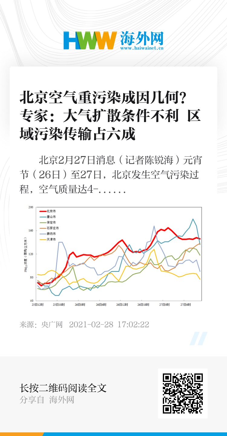 央广网北京2月27日消息(记者陈锐海)元宵节(26日)至27日,北京发生空气污染过程,空气质量达4-5级中重度污染。26日16时,北京启动空气重污染黄色预警。据清华大学教授、大气重污染成因与治理攻关项目北京市跟踪研究工作组组长王书肖分析,北京此次空气重污染成因有3个:大气扩散条件明显不利造成污染物积累、元宵节烟花爆竹集中燃放加重污染、区域污染传输贡献占比达六成。
