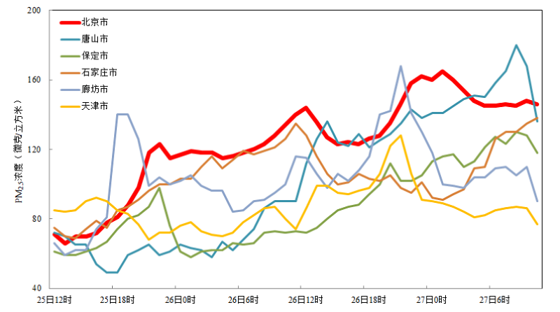 2月25―27日北京及周边城市PM2.5小时浓度变化曲线(央广网发 受访者供图)