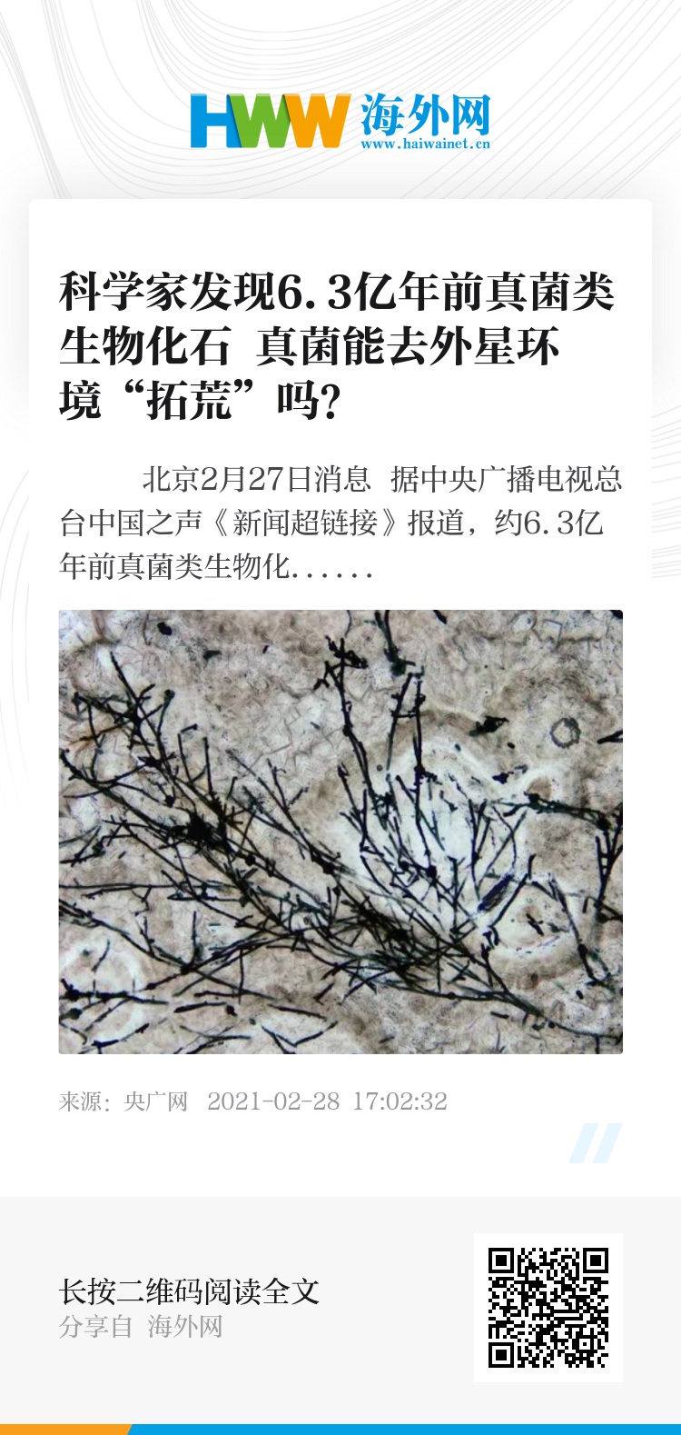 央广网北京2月27日消息 据中央广播电视总台中国之声《新闻超链接》报道,约6.3亿年前真菌类生物化石在我国贵州被发现。这是迄今世界上发现的最早陆生真菌类化石。此前,最早的陆生真菌发现于苏格兰,距今约4.1亿年。
