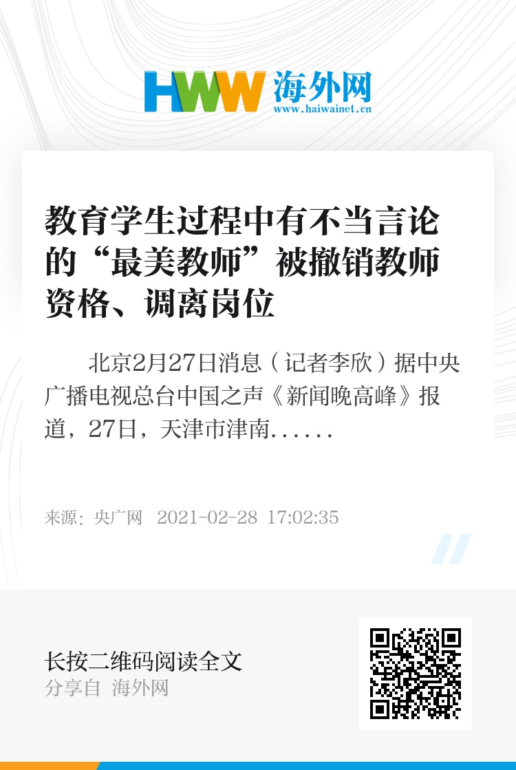 央广网北京2月27日消息(记者李欣)据中央广播电视总台中国之声《新闻晚高峰》报道,27日,天津市津南区教育局通报了“网传肖某某在教育学生过程中存在不当言论事件”的最新处理情况。通报显示,网传情况属实。给予肖某某党内严重警告处分,降低岗位等级,并依据《教师资格条例》撤销其教师资格,调离岗位。