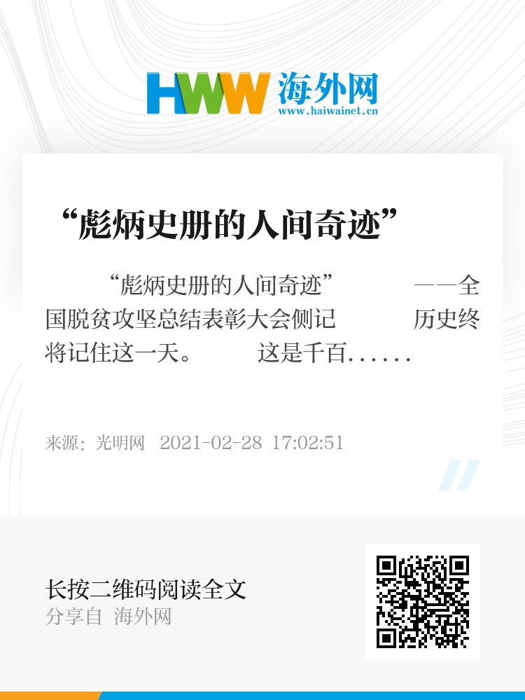 “经过全党全国各族人民共同努力,在迎来中国共产党成立一百周年的重要时刻,我国脱贫攻坚战取得了全面胜利,现行标准下9899万农村贫困人口全部脱贫,832个贫困县全部摘帽,12.8万个贫困村全部出列,区域性整体贫困得到解决,完成了消除绝对贫困的艰巨任务,创造了又一个彪炳史册的人间奇迹!”