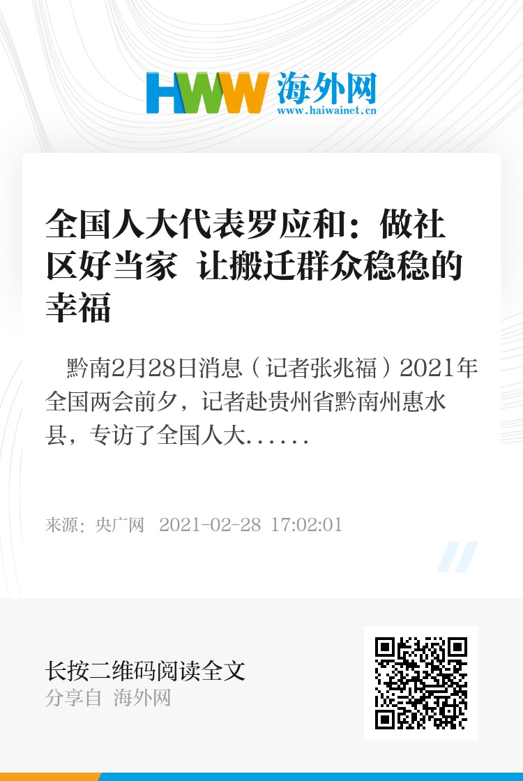 央广网黔南2月28日消息(记者张兆福)2021年全国两会前夕,记者赴贵州省黔南州惠水县,专访了全国人大代表、惠水县明田街道新民社区党支部书记罗应和。刚刚在人民大会堂荣获“全国脱贫攻坚先进个人”荣誉,罗应和把奖章一直带在身上。罗应和说,这份荣誉激励着他在基层岗位上不断奋斗,提醒他继续以脱贫攻坚精神做好搬迁群众后续扶持工作。