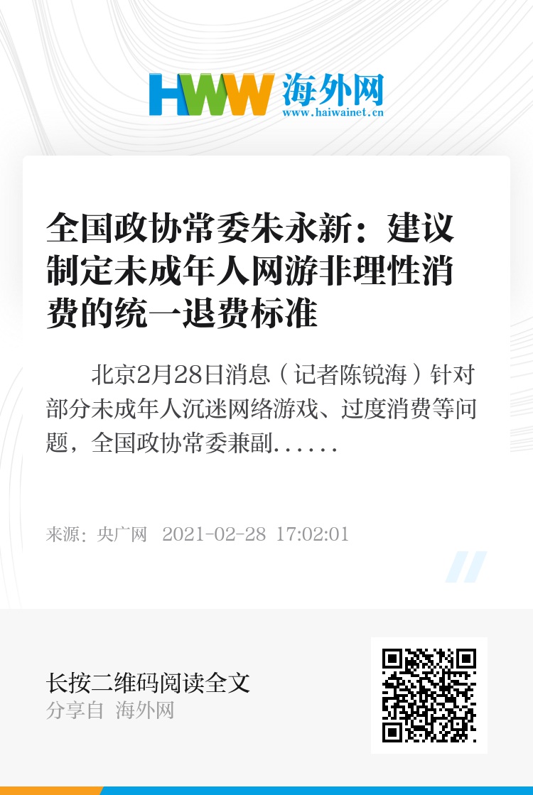 针对非理性消费问题,朱永新建议有关部门要求企业提供未成年人非理性消费的申诉与受理机制,及时受理并处理涉及未成年人游戏的投诉和举报,并制定统一清晰的退费标准,要求所有企业按此执行。