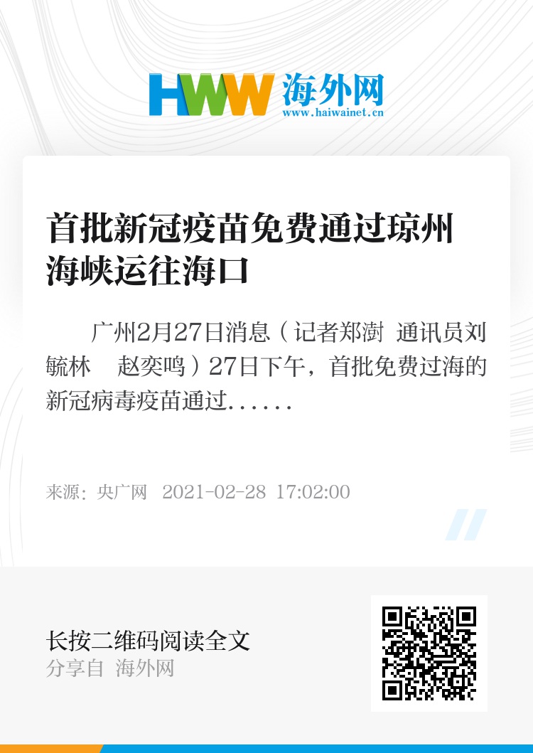 央广网广州2月27日消息(记者郑澍 通讯员刘毓林 赵奕鸣)27日下午,首批免费过海的新冠病毒疫苗通过琼州海峡运往海口,广东湛江海事部门全力服务保障疫苗运输安全畅通。