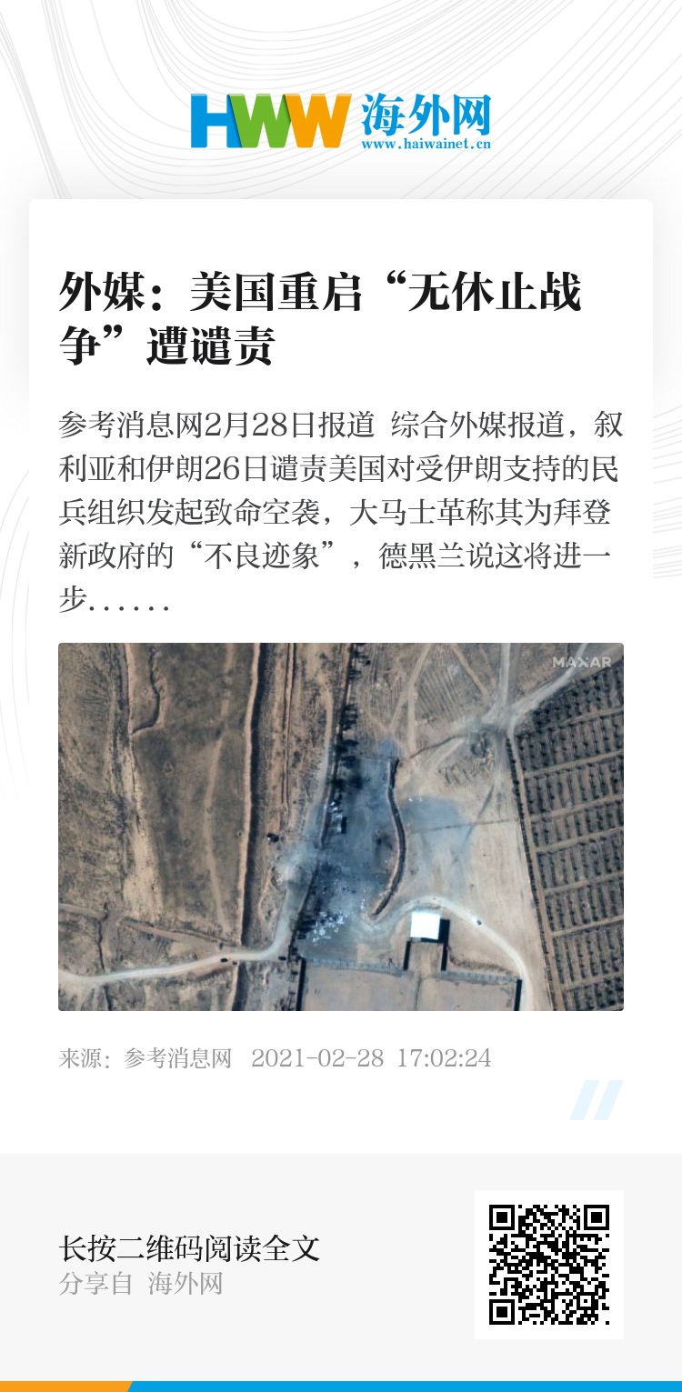 参考消息网2月28日报道 综合外媒报道,叙利亚和伊朗26日谴责美国对受伊朗支持的民兵组织发起致命空袭,大马士革称其为拜登新政府的“不良迹象”,德黑兰说这将进一步破坏地区稳定。