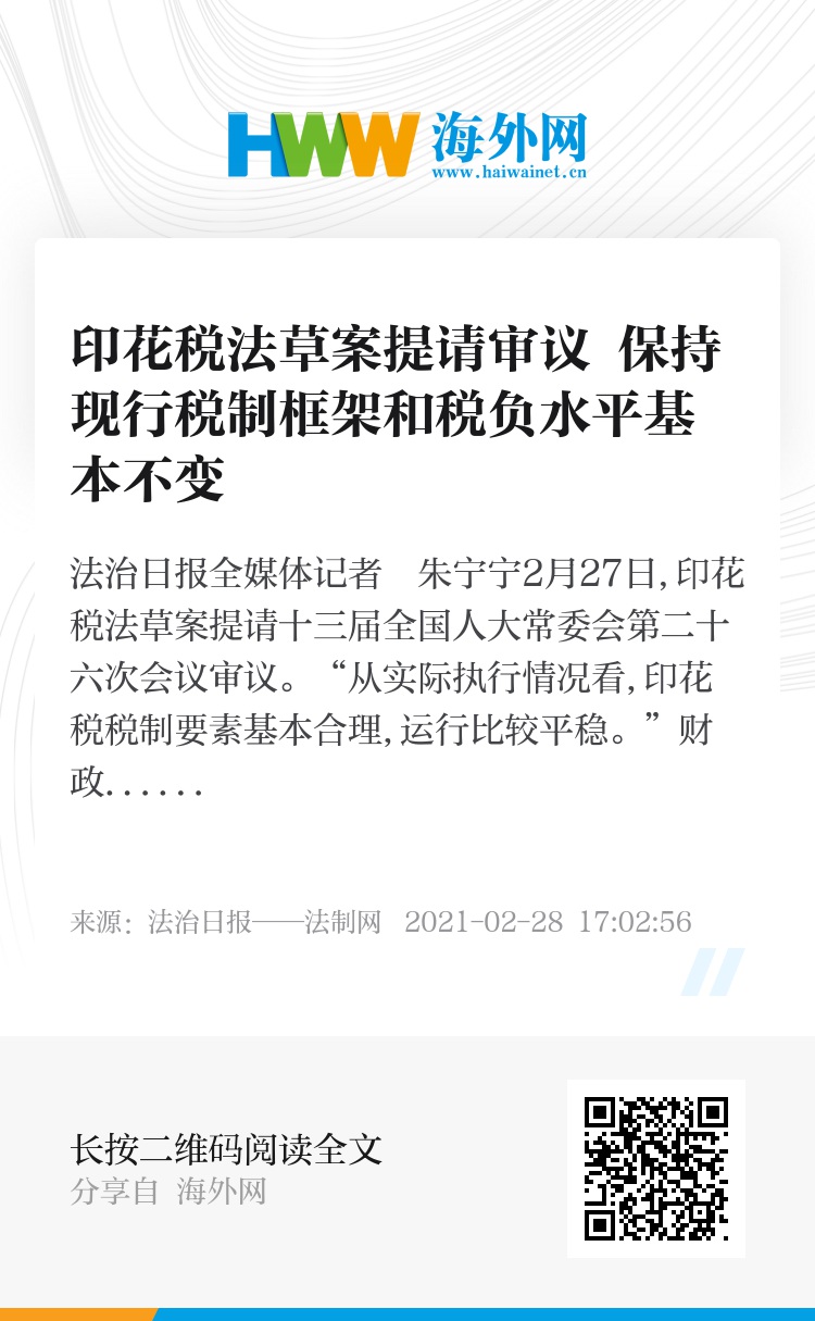 2月27日,印花税法草案提请十三届全国人大常委会第二十六次会议审议。