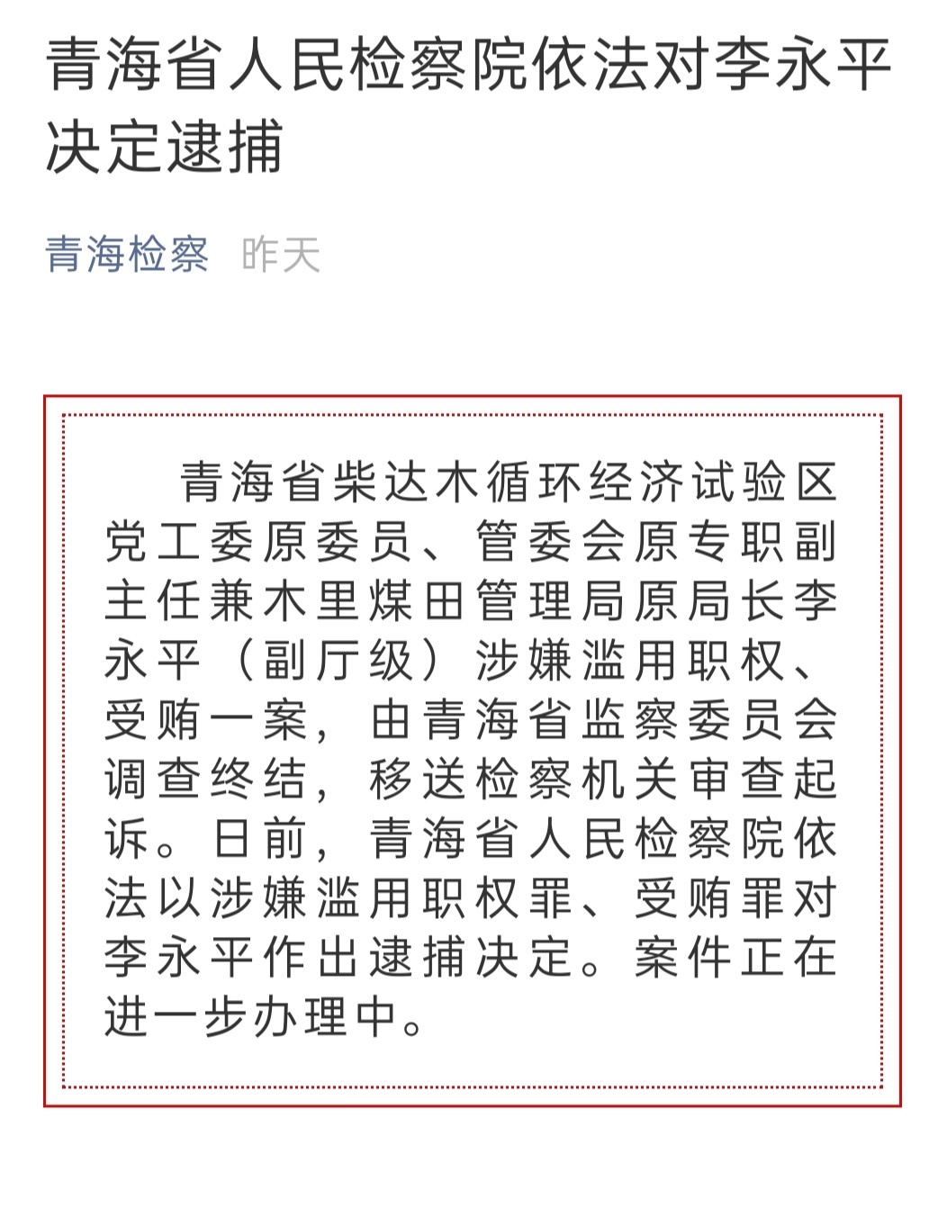 青海省柴达木循环经济试验区党工委原委员、管委会原专职副主任兼木里煤田管理局原局长李永平(副厅级)涉嫌滥用职权、受贿一案,由青海省监察委员会调查终结,移送检察机关审查起诉。日前,青海省人民检察院依法以涉嫌滥用职权罪、受贿罪对李永平作出逮捕决定。案件正在进一步办理中。