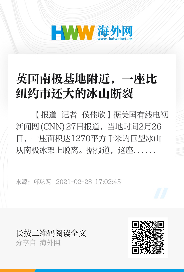 【环球网报道 记者 侯佳欣】据美国有线电视新闻网(CNN)27日报道,当地时间2月26日,一座面积达1270平方千米的巨型冰山从南极冰架上脱离。据报道,这座冰山的面积比美国纽约市还要大。