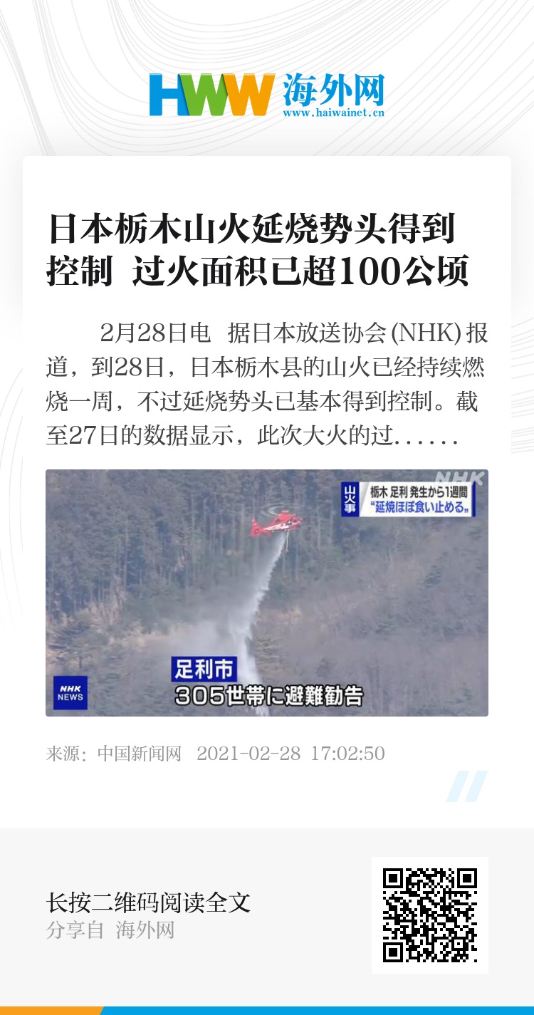 中新网2月28日电 据日本放送协会(NHK)报道,到28日,日本栃木县的山火已经持续燃烧一周,不过延烧势头已基本得到控制。截至27日的数据显示,此次大火的过火面积已达106公顷。