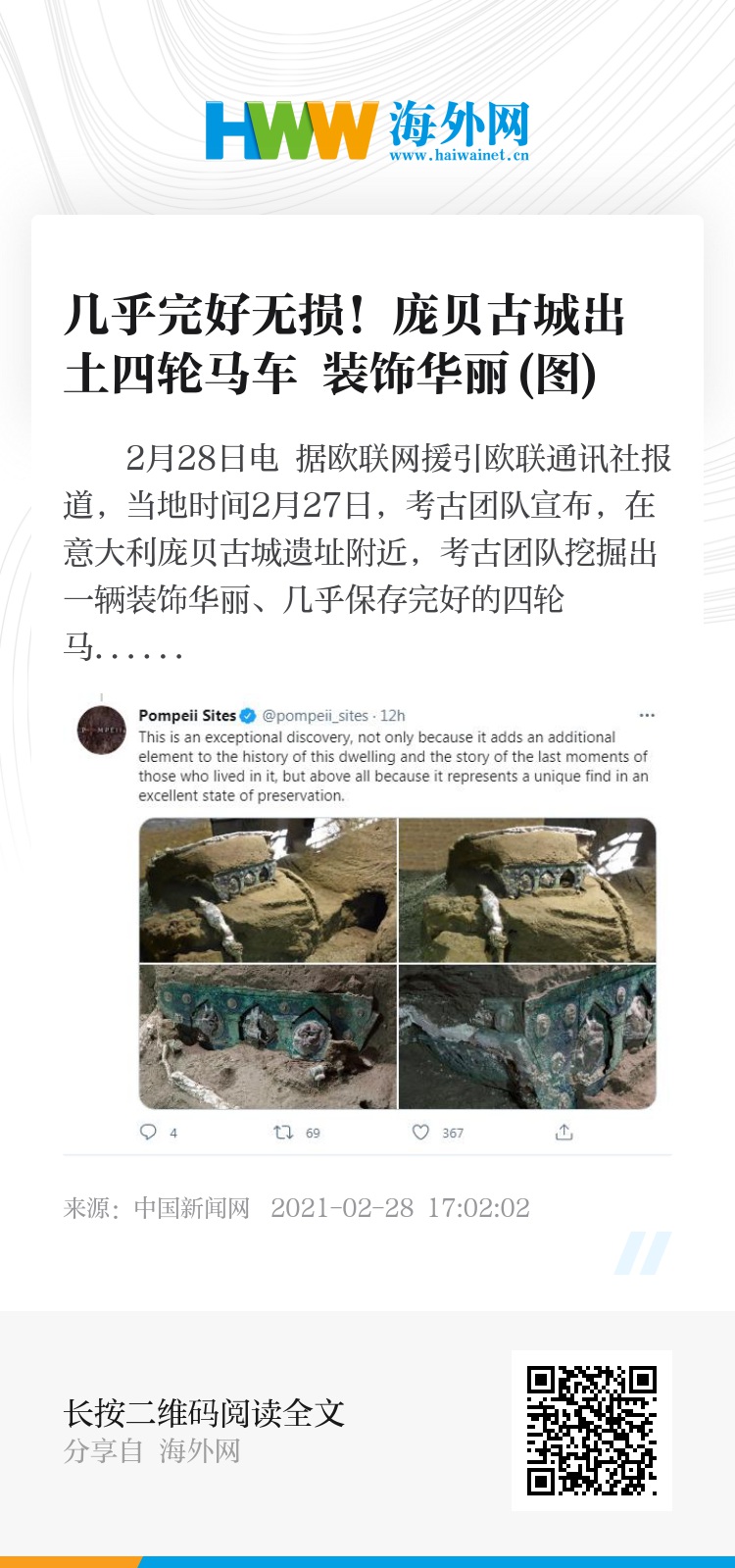 中新网2月28日电 据欧联网援引欧联通讯社报道,当地时间2月27日,考古团队宣布,在意大利庞贝古城遗址附近,考古团队挖掘出一辆装饰华丽、几乎保存完好的四轮马车。意大利文化部门称,这是一个与众不同的发现。