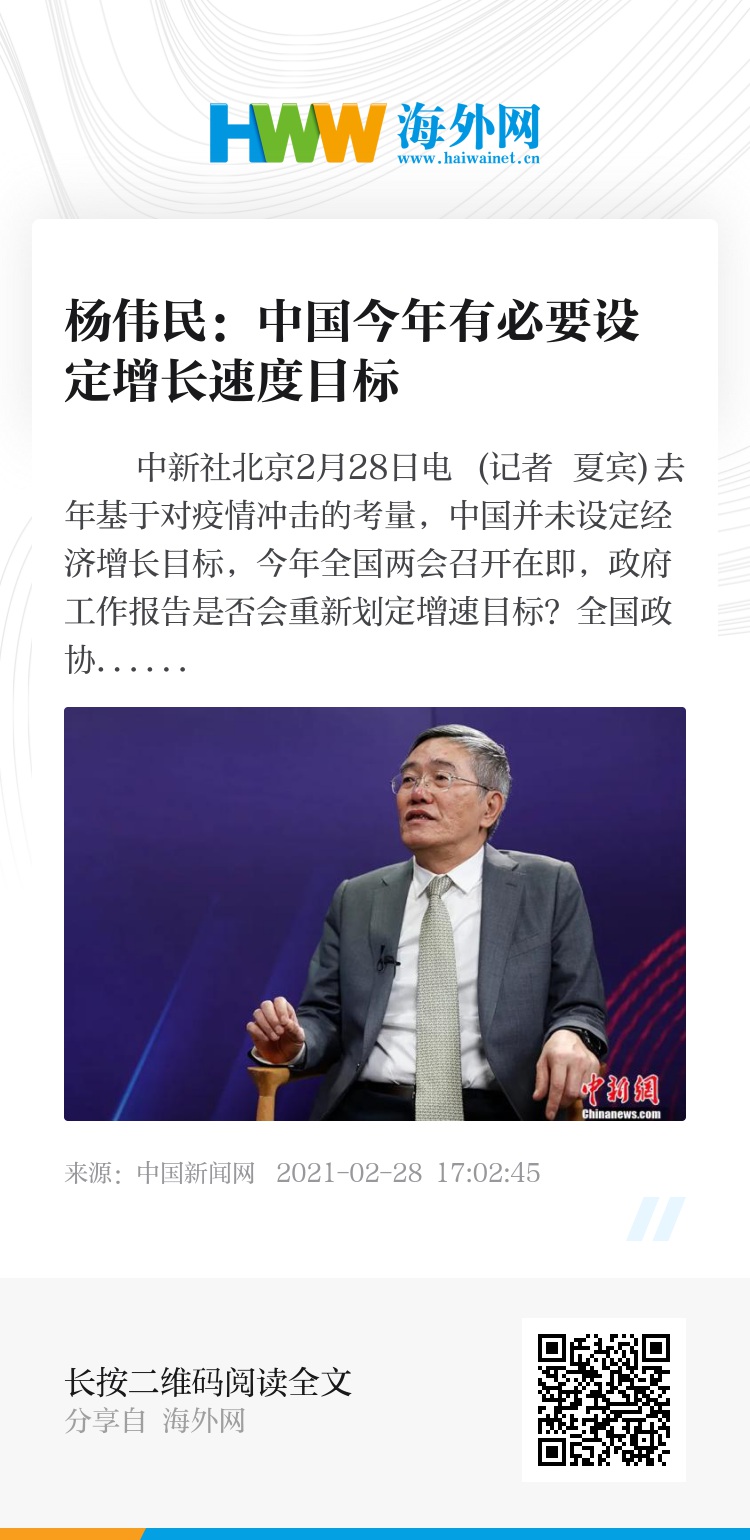 杨伟民直言,在此情况下,今年还是应该提出一个增长速度目标,因为这跟中国长远目标密切相关,党的十九届五中全会不仅规划了未来五年的发展,同时也规划了到2035年的发展目标,其中包括人均GDP要达到中等发达国家水平,这是一个含有定量指标的目标,长远目标必须要从现在开始做起。