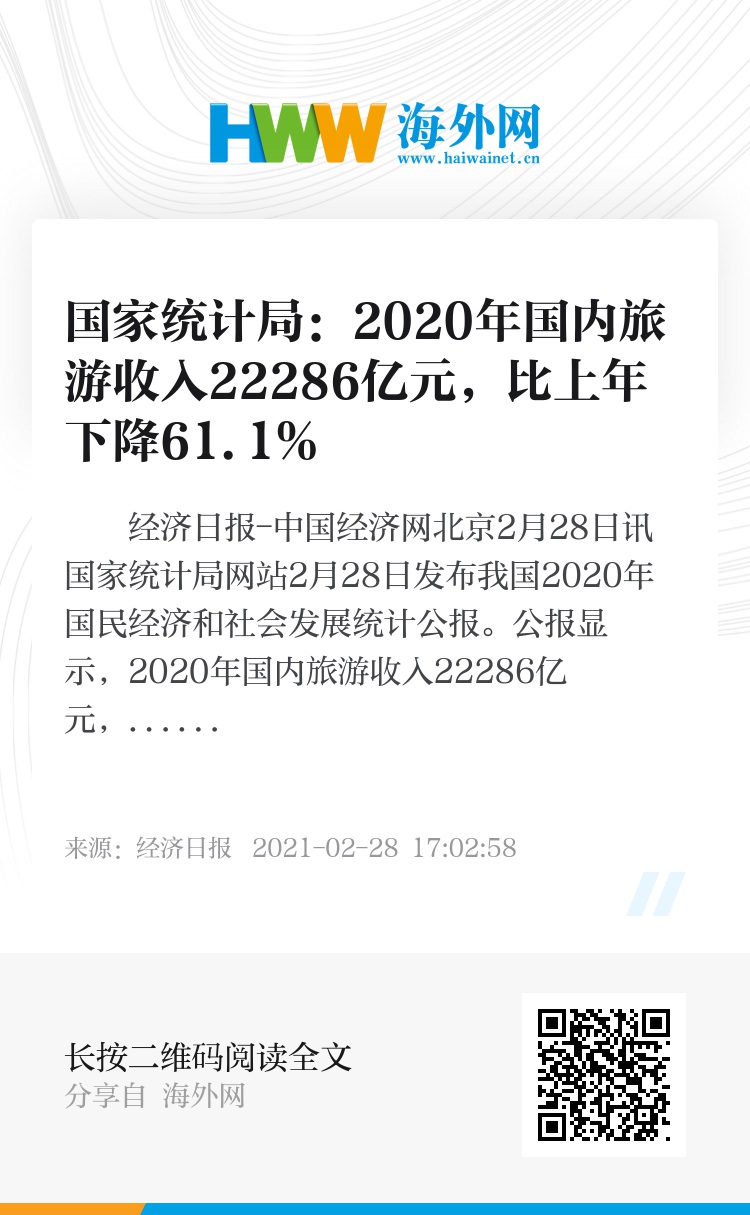 经济日报-中国经济网北京2月28日讯 国家统计局网站2月28日发布我国2020年国民经济和社会发展统计公报。公报显示,2020年国内旅游收入22286亿元,比上年下降61.1%。其中,城镇居民游客花费17967亿元,下降62.2%;农村居民游客花费4320亿元,下降55.7%。