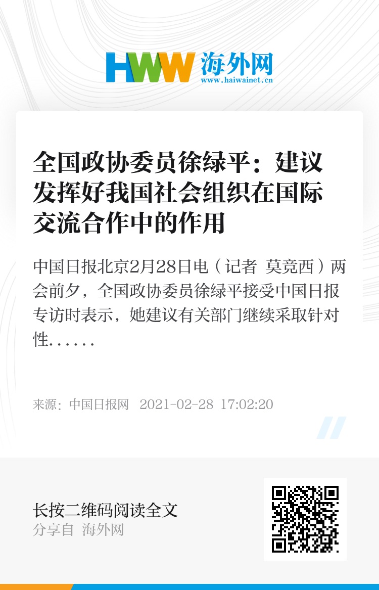 “希望(我国社会组织)更多参与国际有关领域的交流合作,为世界的和平发展做出中国社会组织应有的贡献,”她说。