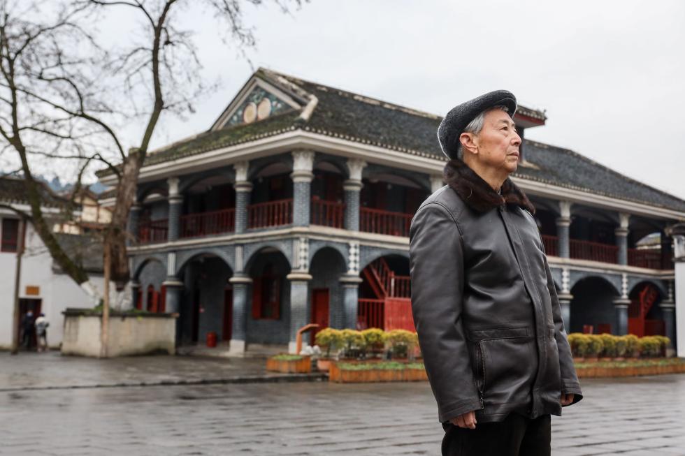 △83岁的遵义会议纪念馆原副馆长田兴咏在遵义会议会址前口述历史(1月27日摄)。新华社记者欧东衢摄