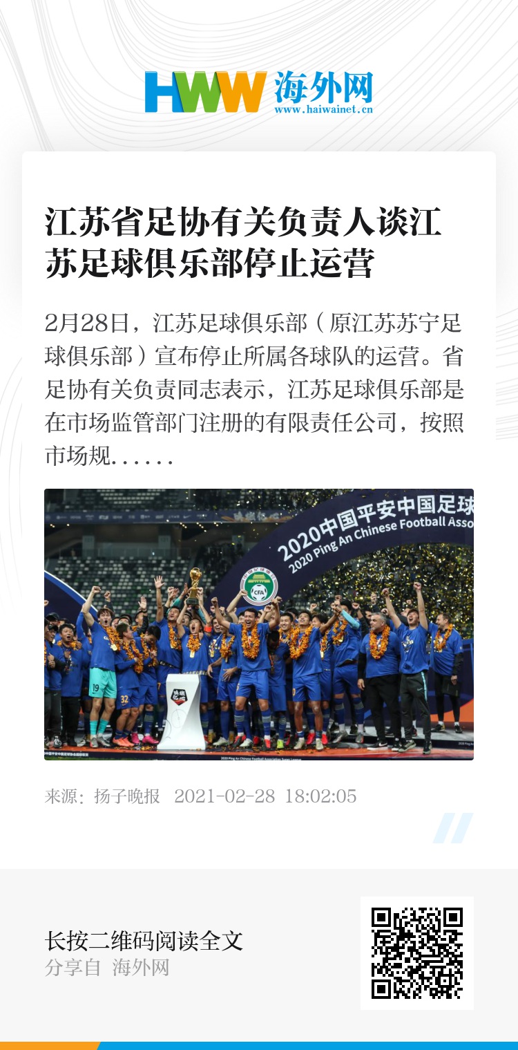 2月28日,江苏足球俱乐部(原江苏苏宁足球俱乐部)宣布停止所属各球队的运营。省足协有关负责同志表示,江苏足球俱乐部是在市场监管部门注册的有限责任公司,按照市场规律和中国足协要求自主运营的法人主体,其经营活动遵循市场化、法制化原则。我们尊重投资人作出的决定,也对俱乐部停止所属各球队的运营表示关注和惋惜,同时呼吁广大球迷理性看待,继续支持江苏足球发展,共同营造良好环境氛围。