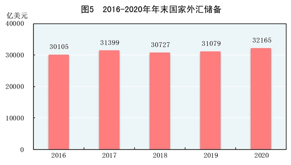 年末国家外汇储备32165亿美元,比上年末增加1086亿美元。全年人民币平均汇率为1美元兑6.8974元人民币,比上年升值0.02%。