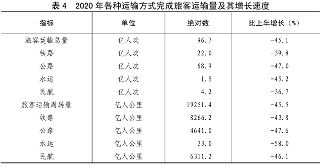 全年旅客运输总量97亿人次,比上年下降45.1%。旅客运输周转量19251亿人公里,下降45.5%。