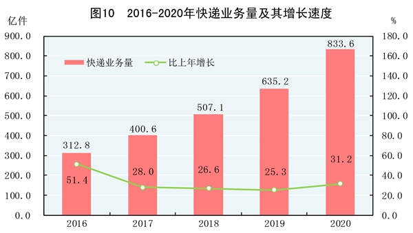 全年完成邮政行业业务总量[25]21053亿元,比上年增长29.7%。邮政业全年完成邮政函件业务14.2亿件,包裹业务0.2亿件,快递业务量833.6亿件,快递业务收入8795亿元。全年完成电信业务总量[26]136758亿元,比上年增长28.1%。年末全国电话用户总数177598万户,其中移动电话用户159407万户。移动电话普及率为113.9部/百人。固定互联网宽带接入用户[27]48355万户,比上年末增加3427万户,其中固定互联网光纤宽带接入用户[28]45414万户,增加3675万户。全年移动互联网用户接入流量1656亿GB,比上年增长35.7%。年末互联网上网人数9.89亿人,其中手机上网人数[29]9.86亿人。互联网普及率为70.4%,其中农村地区互联网普及率为55.9%。全年软件和信息技术服务业[30]完成软件业务收入81616亿元,按可比口径计算,比上年增长13.3%。