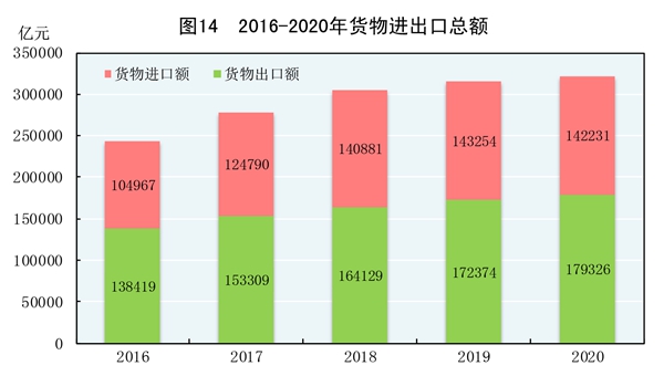 全年货物进出口总额321557亿元,比上年增长1.9%。其中,出口179326亿元,增长4.0%;进口142231亿元,下降0.7%。货物进出口顺差37096亿元,比上年增加7976亿元。对“一带一路”[38]沿线国家进出口总额93696亿元,比上年增长1.0%。其中,出口54263亿元,增长3.2%;进口39433亿元,下降1.8%。