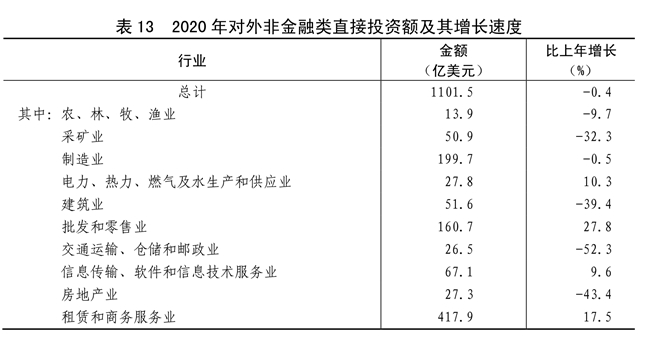 全年对外非金融类直接投资额7598亿元,比上年下降0.4%,折1102亿美元,下降0.4%。其中,对“一带一路”沿线国家非金融类直接投资额178亿美元,增长18.3%。