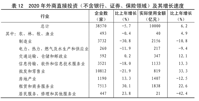 全年外商直接投资(不含银行、证券、保险领域)新设立企业38570家,比上年下降5.7%。实际使用外商直接投资金额10000亿元,增长6.2%,折1444亿美元,增长4.5%。其中“一带一路”沿线国家对华直接投资(含通过部分自由港对华投资)新设立企业4294家,下降23.2%;对华直接投资金额574亿元,下降0.3%,折83亿美元,下降1.8%。全年高技术产业实际使用外资2963亿元,增长11.4%,折428亿美元,增长9.5%。