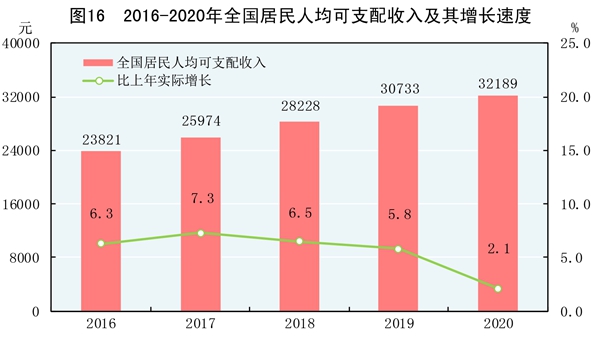 全年全国居民人均可支配收入32189元,比上年增长4.7%,扣除价格因素,实际增长2.1%。全国居民人均可支配收入中位数[47]27540元,增长3.8%。按常住地分,城镇居民人均可支配收入43834元,比上年增长3.5%,扣除价格因素,实际增长1.2%。城镇居民人均可支配收入中位数40378元,增长2.9%。农村居民人均可支配收入17131元,比上年增长6.9%,扣除价格因素,实际增长3.8%。农村居民人均可支配收入中位数15204元,增长5.7%。城乡居民人均可支配收入比值为2.56,比上年缩小0.08。按全国居民五等份收入分组[48],低收入组人均可支配收入7869元,中间偏下收入组人均可支配收入16443元,中间收入组人均可支配收入26249元,中间偏上收入组人均可支配收入41172元,高收入组人均可支配收入80294元。全国农民工人均月收入4072元,比上年增长2.8%。