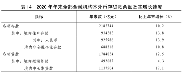 全年社会融资规模增量[40]34.9万亿元,按可比口径计算,比上年多9.2万亿元;年末社会融资规模存量[41]284.8万亿元,按可比口径计算,比上年末增长13.3%,其中对实体经济发放的人民币贷款余额171.6万亿元,增长13.2%。年末全部金融机构本外币各项存款余额218.4万亿元,比年初增加20.2万亿元,其中人民币各项存款余额212.6万亿元,增加19.6万亿元。全部金融机构本外币各项贷款余额178.4万亿元,增加19.8万亿元,其中人民币各项贷款余额172.7万亿元,增加19.6万亿元。人民币普惠金融贷款[42]余额21.5万亿元,增加4.2万亿元。
