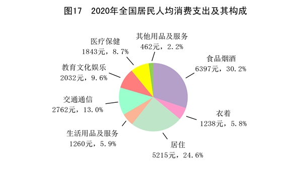 全年全国居民人均消费支出21210元,比上年下降1.6%,扣除价格因素,实际下降4.0%。其中,人均服务性消费支出[49]9037元,比上年下降8.6%,占居民人均消费支出的比重为42.6%。按常住地分,城镇居民人均消费支出27007元,下降3.8%,扣除价格因素,实际下降6.0%;农村居民人均消费支出13713元,增长2.9%,扣除价格因素,实际下降0.1%。全国居民恩格尔系数为30.2%,其中城镇为29.2%,农村为32.7%。