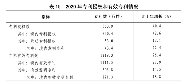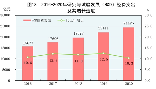全年研究与试验发展(R&D)经费支出24426亿元,比上年增长10.3%,与国内生产总值之比为2.40%,其中基础研究经费1504亿元。国家科技重大专项共安排198个项目(课题),国家自然科学基金共资助4.57万个项目。截至年末,正在运行的国家重点实验室522个,国家工程研究中心(国家工程实验室)350个,国家企业技术中心1636家,大众创业万众创新示范基地212家。国家级科技企业孵化器[54]1173家,国家备案众创空间[55]2386家。全年授予专利权363.9万件,比上年增长40.4%;PCT专利申请受理量[56]7.2万件。截至年末,有效专利1219.3万件,其中境内有效发明专利221.3万件,预计每万人口发明专利拥有量15.8件。全年商标注册576.1万件,比上年下降10.1%。全年共签订技术合同55万项,技术合同成交金额28252亿元,比上年增长26.1%。